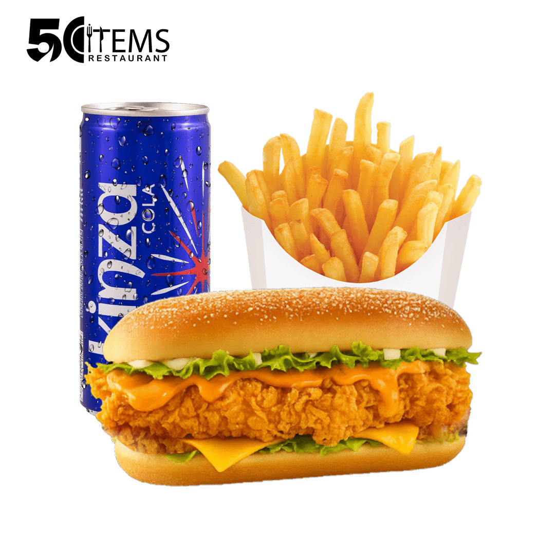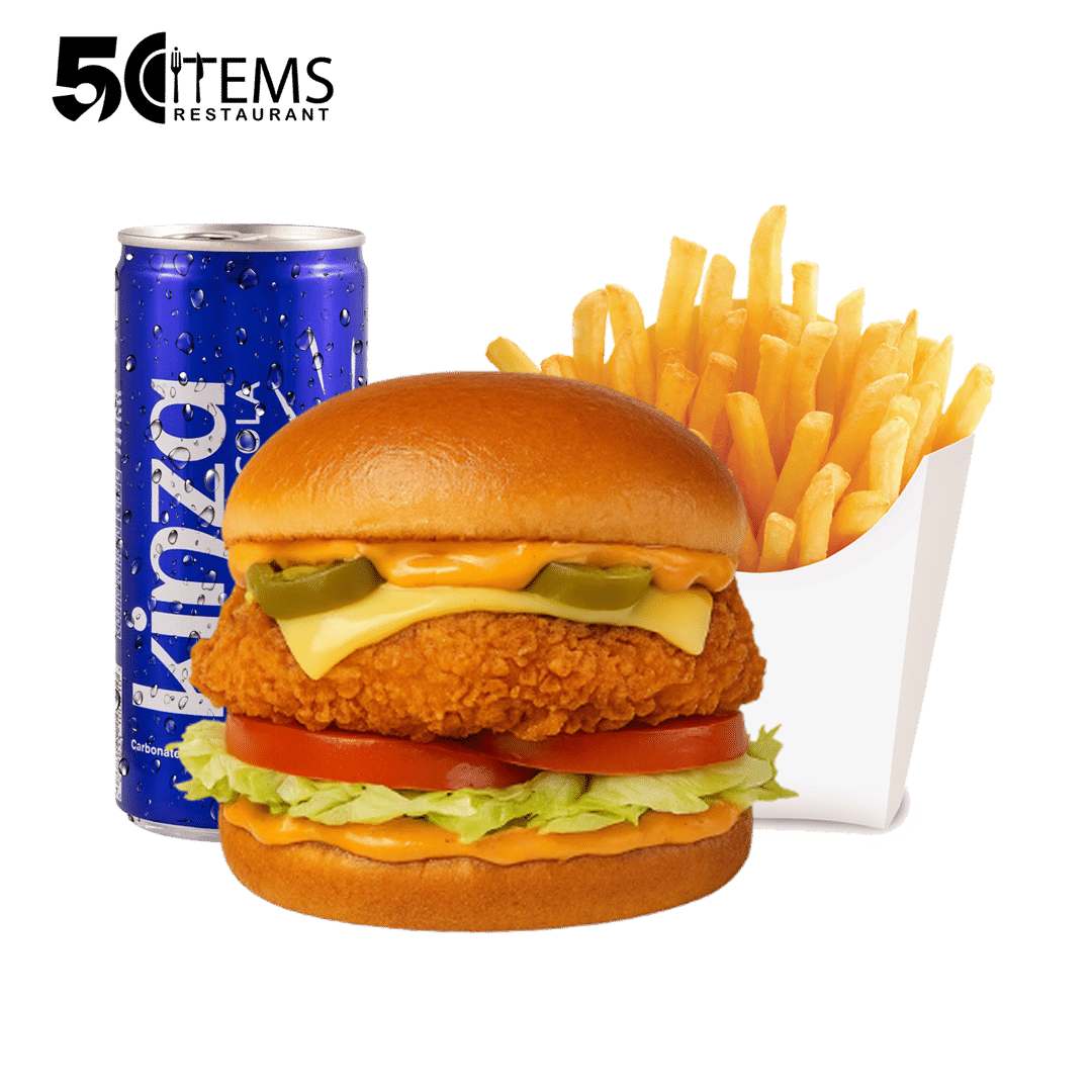 برجر دياي مقلي على مزاجك، يقدم بخبز ناعم بدون سمسم، خس طازج، جبنة سايحة تذوب مع كل قضمة، وصوص شيكاغو الوردي المميز اللي يطرطش نكهة في كل زاوية. الوجبة تشمل بطاطا مقرمشة ومشروب بارد لتجربة متكاملة ولذيذة.