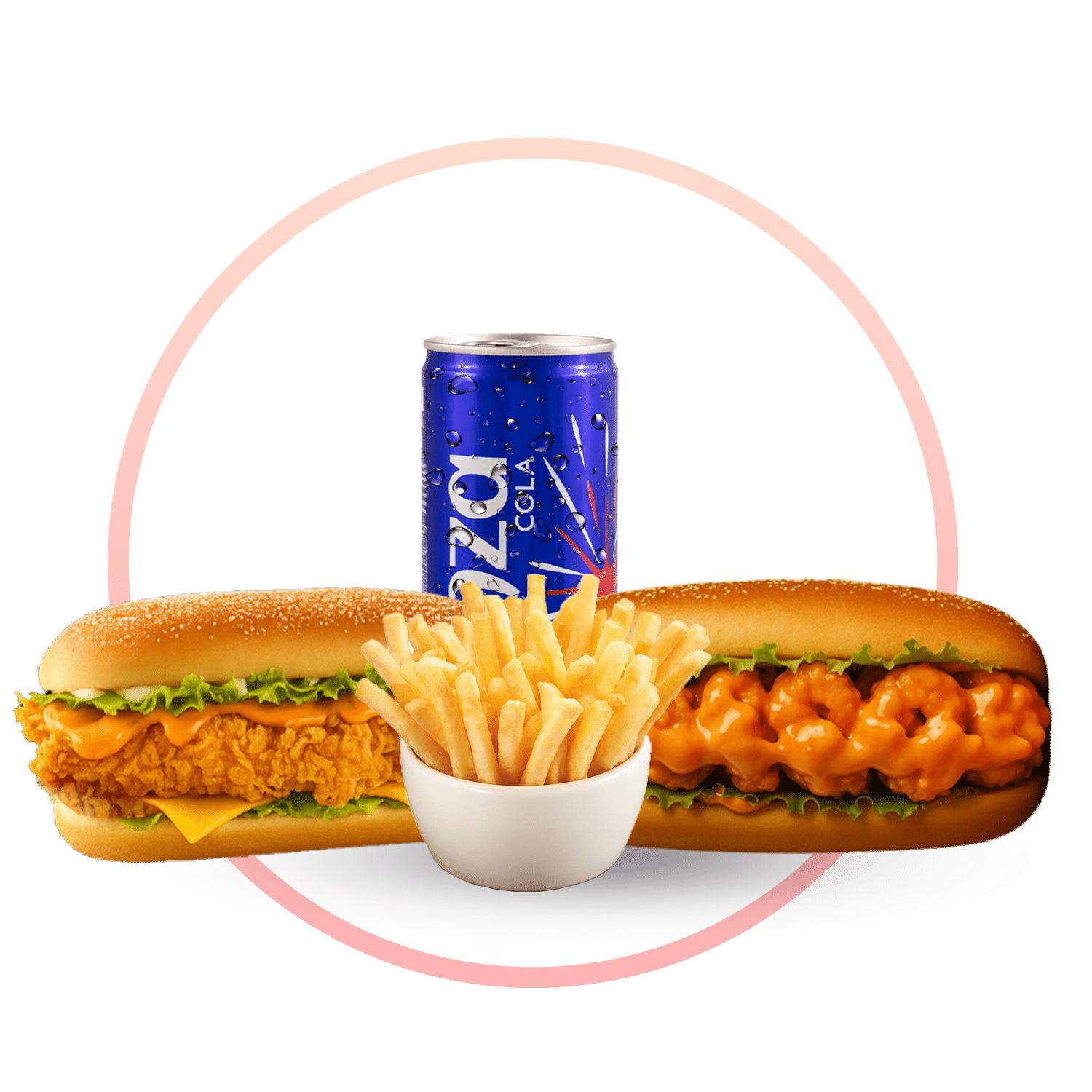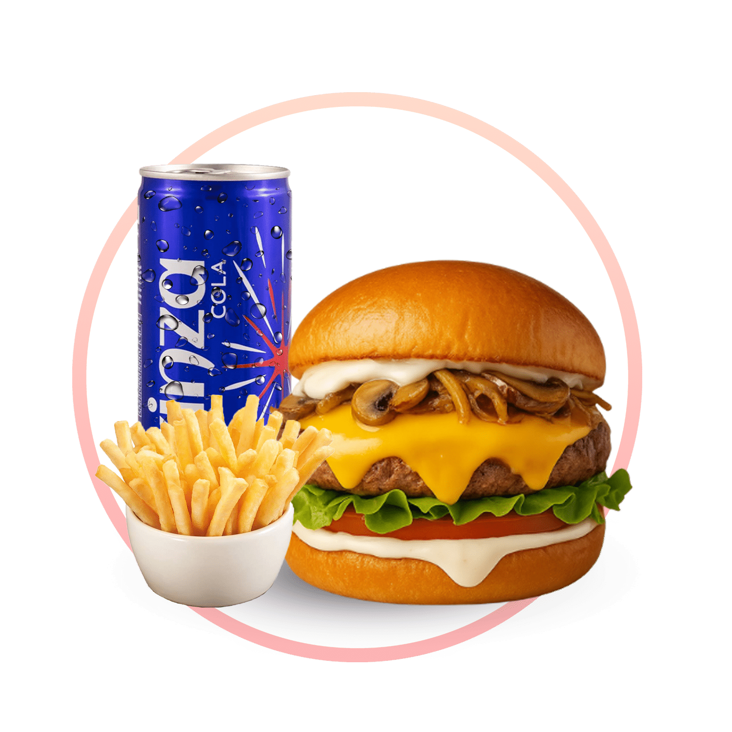 برجر دياي مقلي على مزاج، بخبز ناعم بدون سمسم، خس، جبنة سايحة، وصوص شيكاغو وردي يطرطش نكهة. بطاطا – مشروب