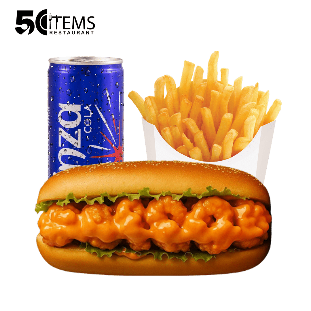 روبيان مع صوص ديناميت داخل صمون، خفيف بس ناري. بطاطا – مشروب