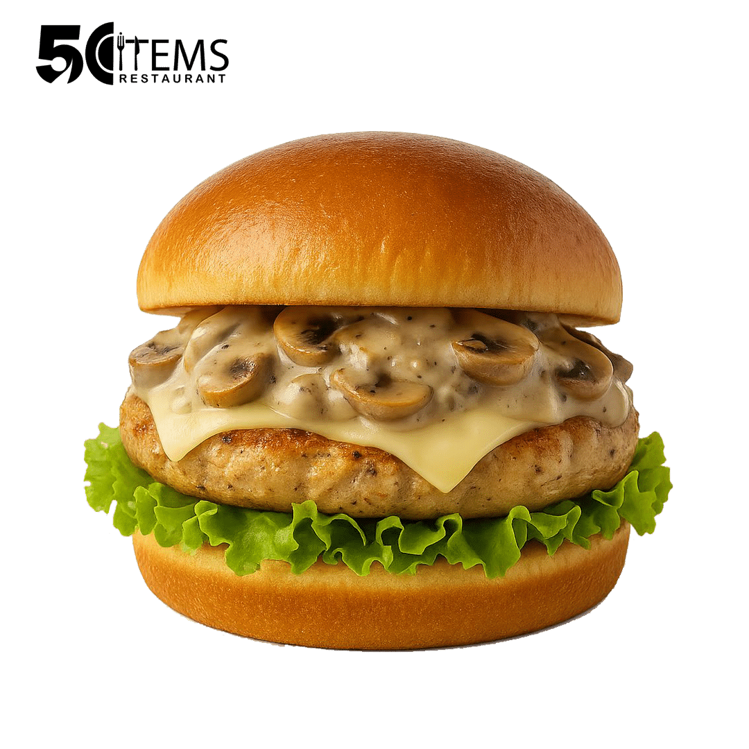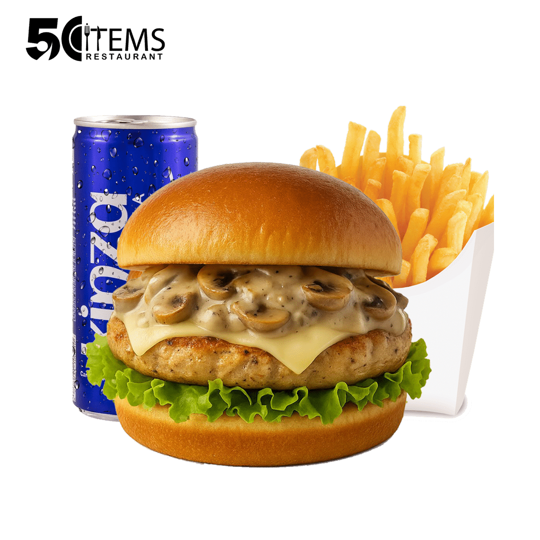 برجر مشروم تشيكن محضر من صدور دجاج مشوية بعناية، مغطاة بصلصة كريمية بالفطر الطازج، جبنة ذائبة، وخس طازج داخل خبز برجر طري. مزيج شهي يجمع بين طراوة الدجاج ونكهة المشروم الغنية.