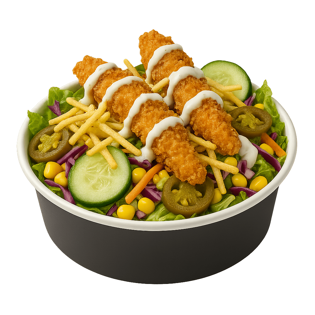 خس طازج مع ملفوف أحمر وجزر مبشور وحبات ذرة صفراء، يضاف لها خيار شرائح وهالبينو حار، topped بقطع دجاج ستربس مقرمشة ذهبية. تتزين بشيبس ستكس كريسبي وصوص رانش يرفع الطعم.