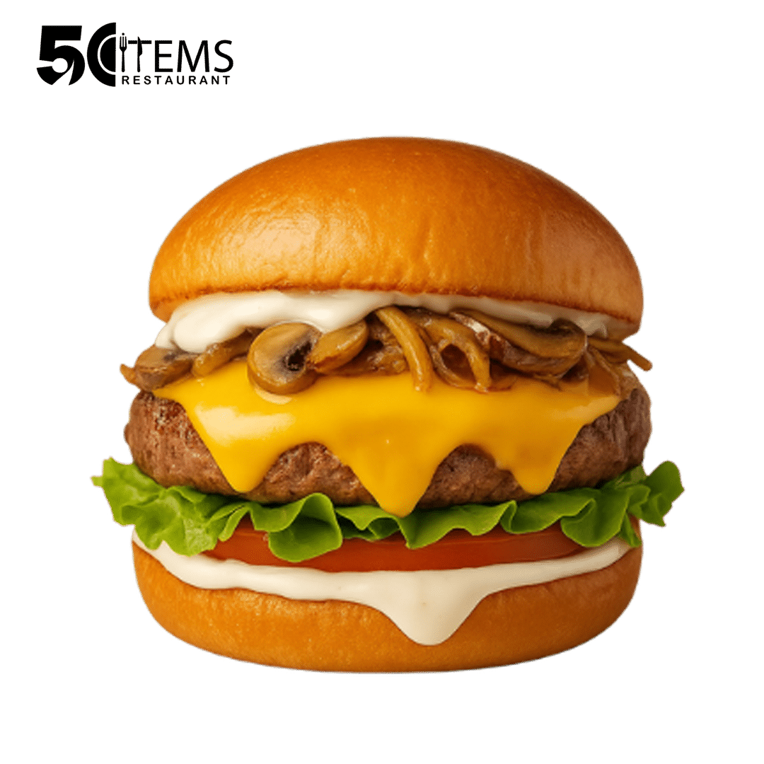 برجر لحم بيف مشوي، topped بشرايح مشروم سوتيه الغنية، مع جبنة سايحة تضيف نكهة كريمية، وكل ده داخل خبز ناعم وطازج. مزيج مثالي لعشاق الطعم العميق والدسم، ونكهة المشروم اللي تكمّل كل لقمة.