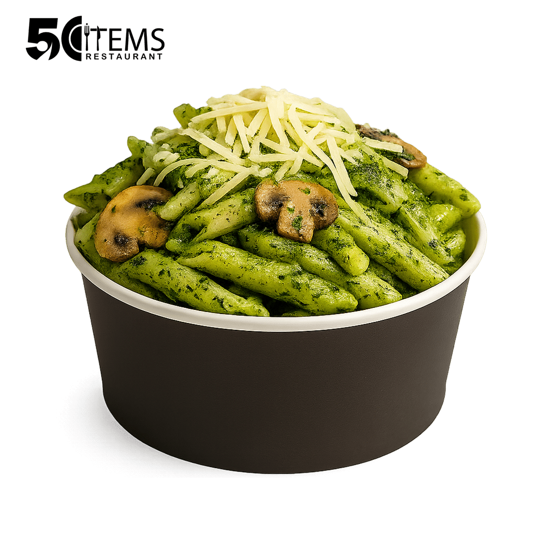 مكرونة بينا تُقدَّم بصوص بيستو أخضر طازج، مع مشروم سوتيه، جبنة موتزاريلا الذائبة، ولمسة زيت زيتون بكر تضيف عمق للطعم. طبق نباتي غني بالنكهة والطزاجة.