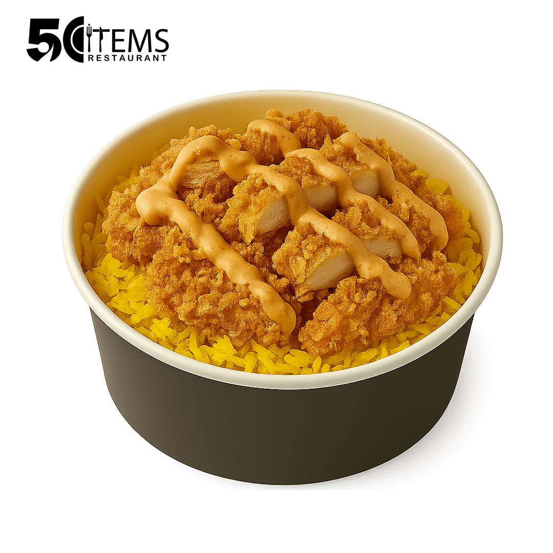 أرز أصفر متبّل بلمسة زعفران، يجي مع استربس دجاج مقرمشة وصوص يفتح النفس. وجبة مليانة طعم وقرمشة في كل لقمة.