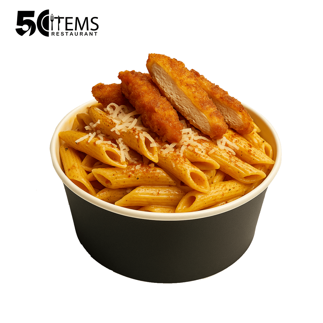 مكرونة بينا في صوص كريمي كاجن سبايسي، تقدم مع دجاج كرسبي مقرمش، ورشة بارميزان ولمسة من البابريكا المدخنة. طبق جريء، كريمي، ومتوازن في نكهته – لمحبي السبايسي الراقي!